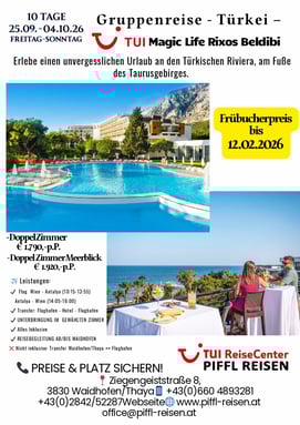 Preis: ab € 1.659,-- p.P. und € 492,--p.Kind