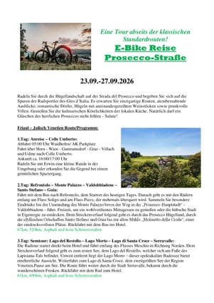 Erleben Sie vom 23.–27.09.2026 eine einzigartige E-Bike-Reise abseits der klassischen Routen! Durch sanfte Hügel, endlose Weinberge und romantische Dörfer folgen wir der berühmten Strada del Prosecco und den Spuren des Giro d’Italia.