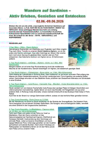 8 Tage traumhafte Küstenlandschaften, mediterrane Macchia, smaragdgrünes Meer und kulinarische Highlights erwarten Sie. Von Alghero bis zur Costa Smeralda wandern Sie auf abwechslungsreichen